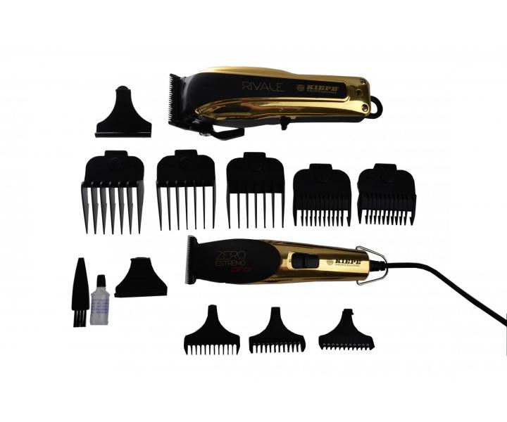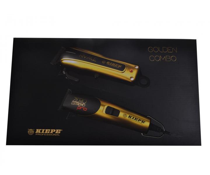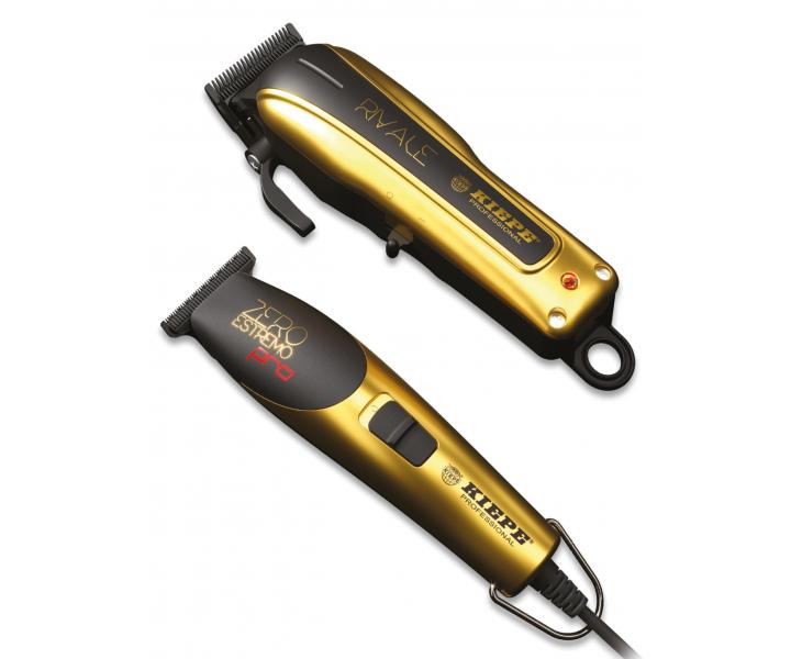 Profesjonalny zestaw do strzyżenia włosów obejmuje bezprzewodową maszynkę do strzyżenia Kiepe Rivale i przewodowy trymer Kiepe Zero Estremo, oba urządzenia w luksusowym złotym wykończeniu.