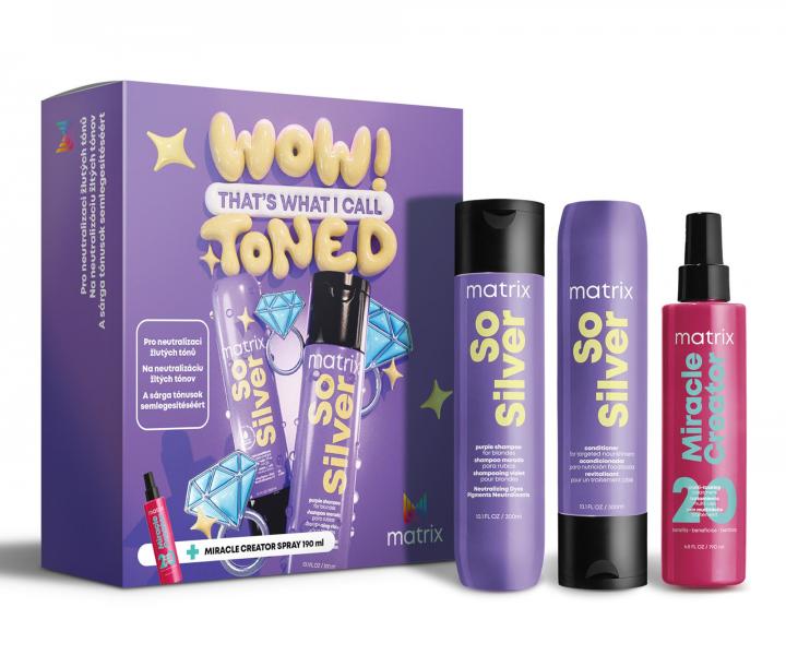 | Seria produktów neutralizujących żółte odcienie Matrix So Silver Rodzaj produktu: zestaw upominkowy - szampon + odżywka + spray bez spłukiwania |